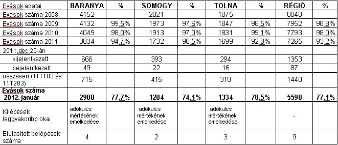 Az egyszerűsített adózási módot 2012. évre mindössze 87 új adózó választotta, kilépés mellett viszont 1353-an döntöttek a régióban. Így csökkent az előző évi háromnegyedére az evások száma a Dél-Dunántúlon.