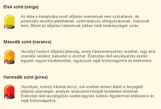 Az OMSZ előzetes figyelmeztetést és riasztást heves zivatar, felhőszakadás, széllökés, ónos eső és hófúvás esetén ad ki. Első lépcsőben készül egy az adott napra, valamint a következő napra szóló, szöveges és térképes formában is megjelenő előzetes figyelmeztetés, amelyben a legvalószínűbb veszélyes időjárási események várt térbeli és időbeli leírását adják meg. Második lépcsőben az esemény bekövetkezése előtt fél-3 órával adják ki a térképes formában megjelenő riasztást. A rendszer részét képezik még a nagy mennyiségű esőre, hóra vonatkozó figyelmeztetések, valamint a hőhullám, rendkívüli hideg, továbbá a tartós sűrű köd és a talaj menti fagy esetén kiadandó speciális figyelmeztetések, ha az esemény legalább egy átlagos megyének megfelelő területen várhatóan jellemző lesz. A figyelmeztetésekben és a riasztásokban három veszélyességi szintet különböztetnek meg, a sárgát, a narancsot és a pirosat.