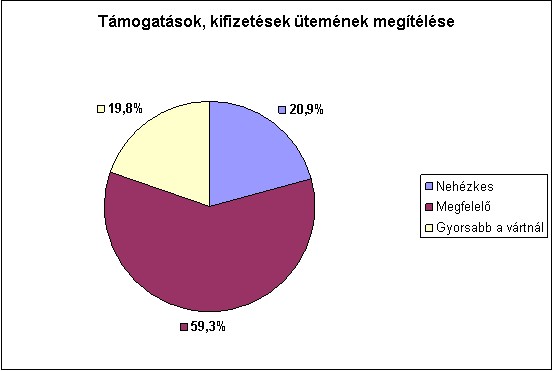 A támogatások kifizetésének ütemét értékelve a kérdőívet kitöltők 20,9 %-a nehézkesnek vélte a teljesítést, 59,3 %-uk megfelelőnek tartja és 19,8 %-uk szerint a kifizetések ütemezése gyorsabb a vártnál (3. ábra).