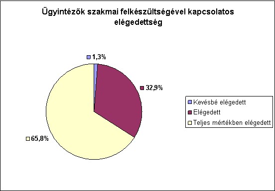 Az ügyintézők szakmai felkészültségével, emberi hozzáállásával a válaszadók többsége (65,8 %) teljes mértékben elégedett volt, további 32,9 % elégedettségét fejezte ki, csupán a megkérdezettek 1,3 %-a volt kevésbé elégedett ügyintézője szakmai felkészültségével (2. ábra).