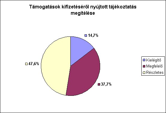 A Somogy Megyei Kormányhivatal munkatársai által nyújtott tájékoztatás a támogatások kifizetésével kapcsolatban az ügyfelek közel felének (47,6 %) véleménye szerint igen részletes. A megkérdezettek 37,7 %-a véli úgy, hogy megfelelő tájékoztatást kapott, 14,7 %-uk kielégítőnek tartja a kapott információt (1. ábra).