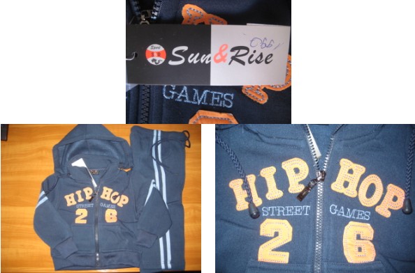 A termék leírása: 2 részes gyermek szabadidő garnitúra. A felsőrész elől végig cipzáras, lecipzározható kapucnis, kenguruzsebes, belül bolyhosított. Elején „HIP HOP (street games) 26" rávarrt díszítéssel. A két felkarrészen keresztbe, a nadrágon oldalt hosszába 2-2 eltérő színű díszítő csík van. A kapucniban kör szövött összehúzó zsinór van, szabad végein műanyag végelzárókkal. A nadrág gumírozott derékrészében belülre lógó cipőfűző végződésű behúzó zsinór van.