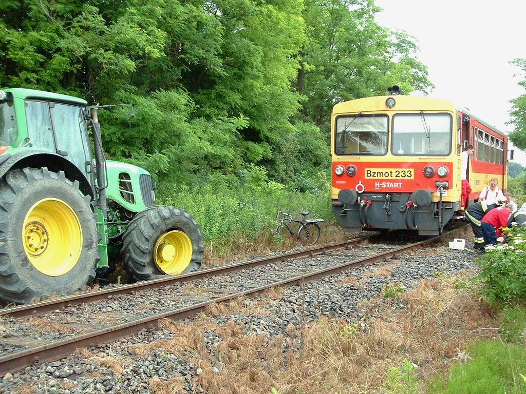 A traktor kaszálás közben eddig ismeretlen okból ráhajtott a nyílt vasúti pályán a sínekre és összeütközött a Kaposvár felől érkező vonattal. A vonaton két utas és a mozdonyvezető tartózkodott. Az egyik utas súlyosan megsérült, őt a mentők vákumágyban a siófoki kórházba szállították. A traktort vezető férfi könnyebb sérüléseit a mentők a helyszínen ellátták. A tűzoltók helyszínre vonulását nehezítette, hogy a káreset a műúttól 1,5 kilométerre történt és csak földúton volt megközelíthető. Az ütközés erejétől a vonat szélvédője kitört és megrongálódott a bal eleje. A traktorból kiszakadt a motor, kidurrant a kereke és a jobb oldala összetört. A traktor kerekével a sínre lóg, ezért azt a tabi tűzoltók erőgéppel közösen fogják levontatni onnan. A sínpálya nem sérült, a helyszínelés ideje alatt a vasúti forgalom szünetel a Kaposvár Siófok közötti szakaszon. A keletkezett kár értéke közel 50 millió forint.