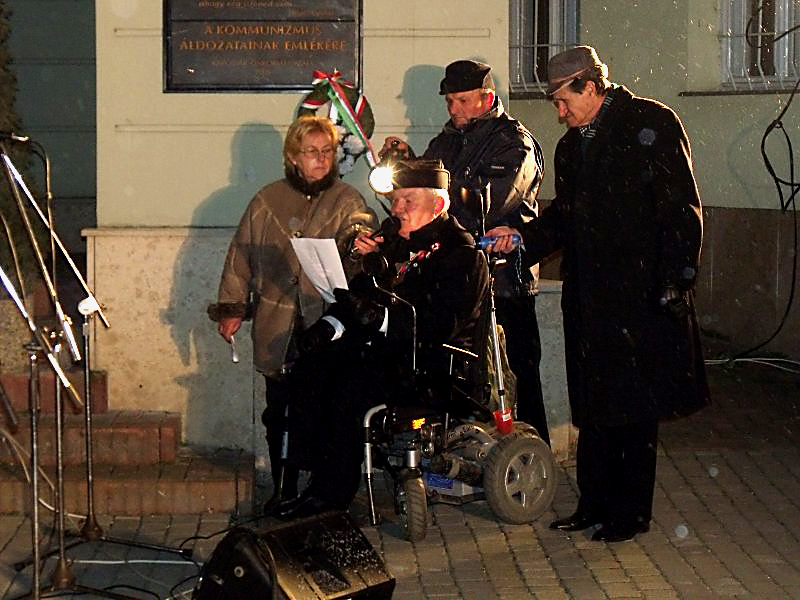 Csend. Kaposvár emlékezik némán. Csak Nagy Feró hangja hallatszik a hangszórókból: - Nem félek... S ma már tényleg nem kell félnünk. De akkor amikor a filmen szereplő részletek készültek, akkor kellett. Nagyon. S akkor is még oda kellett figyelni amikor Nagy Feró 1983-84 táján elénekelte a dalt. 1984. Orwell. Aki évtizedekkel korábban megírta a rendszer álnokságát. A napról napra változó történelmet, a múlt tagadását, az önkényt és elnyomást. A szabadság és demokrácia illúzióját, amit a magyarok is átéltek negyven évig. Népi demokrácia. Ahol a nép csak mellékszereplő az elvtársak öncélú, kapzsi és barbár játékában. Álnokul szerzett hatalom, félrevezetett, ideológiai roncs ország. A film csak hét perc, a diktatúra több évtized. Elsötétül a Kapos Hotel fala, elhallgatnak a hangszórók. Az emlékezők a Városháza Teleki utcai homlokzatára áthelyezett emléktáblához vonulnak, ahol eléneklik a Himnuszt, meghallgatják a Füred Rock Szín Kör műsorát és dr Szili Ferenc gondolatait. Kaposvár díszpolgára az előző század üzenetét boncolgatja a történelem régebbi korainak tükrében. A kommunizmus bűneinek teljes feltárása az eltitkolt és eltűnt dokumentumok ellenére a történészek felelőssége, mely feltárás a modern kori Nérók, a huszadik századi bűnösök megnevezéséig kell tartson. A díszpolgár emlékezése után egy túlélő, egy gulágot megjárt kaposvári ismertette a kényszermunkatáborok mindennapjait, majd az emléktáblánál koszorúztak megyei és városi vezetők, pártok és civil szervezetek a szocialisták kivételével, akik nem jelentek meg az ünnepségen. Bár lehet, hogy ott voltak, csak elfedte őket az este sötétje. Az emlékezés virágai mellé mécsesek kerültek, s a Szózatot énekelte a Táncsics Gimnázium kórusa.