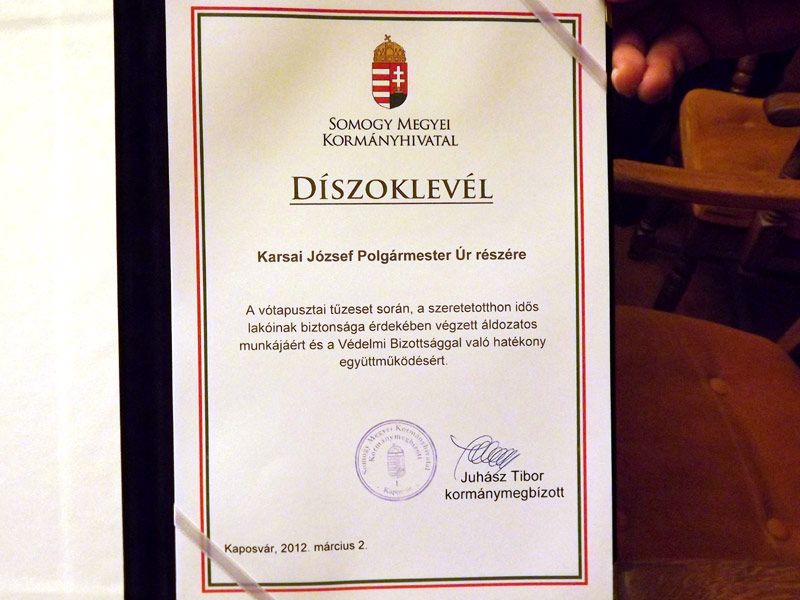 Az ünnepi ülés végén Juhász Tibor kormánymegbízott díszoklevelet adott át a vótapusztai tűzeset során az otthon lakóinak biztonsága érdekében végzett áldozatos munkájáért: